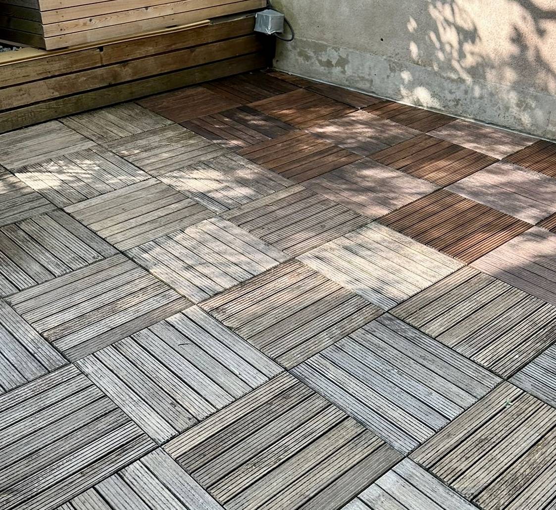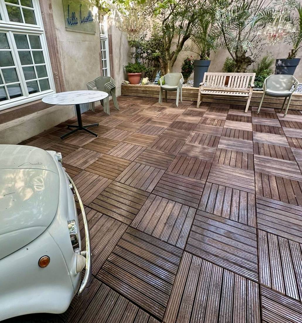 Le bois caillebotis, bien que très esthétique, est une matière vivante et exigeante. Exposé au soleil, à la pluie et au passage quotidien des clients, il peut griser, se salir, devenir glissant ou inégalement usé. C’est dans cet état que nous avons trouvé la terrasse de La Villa Casella, en début de saison estivale.